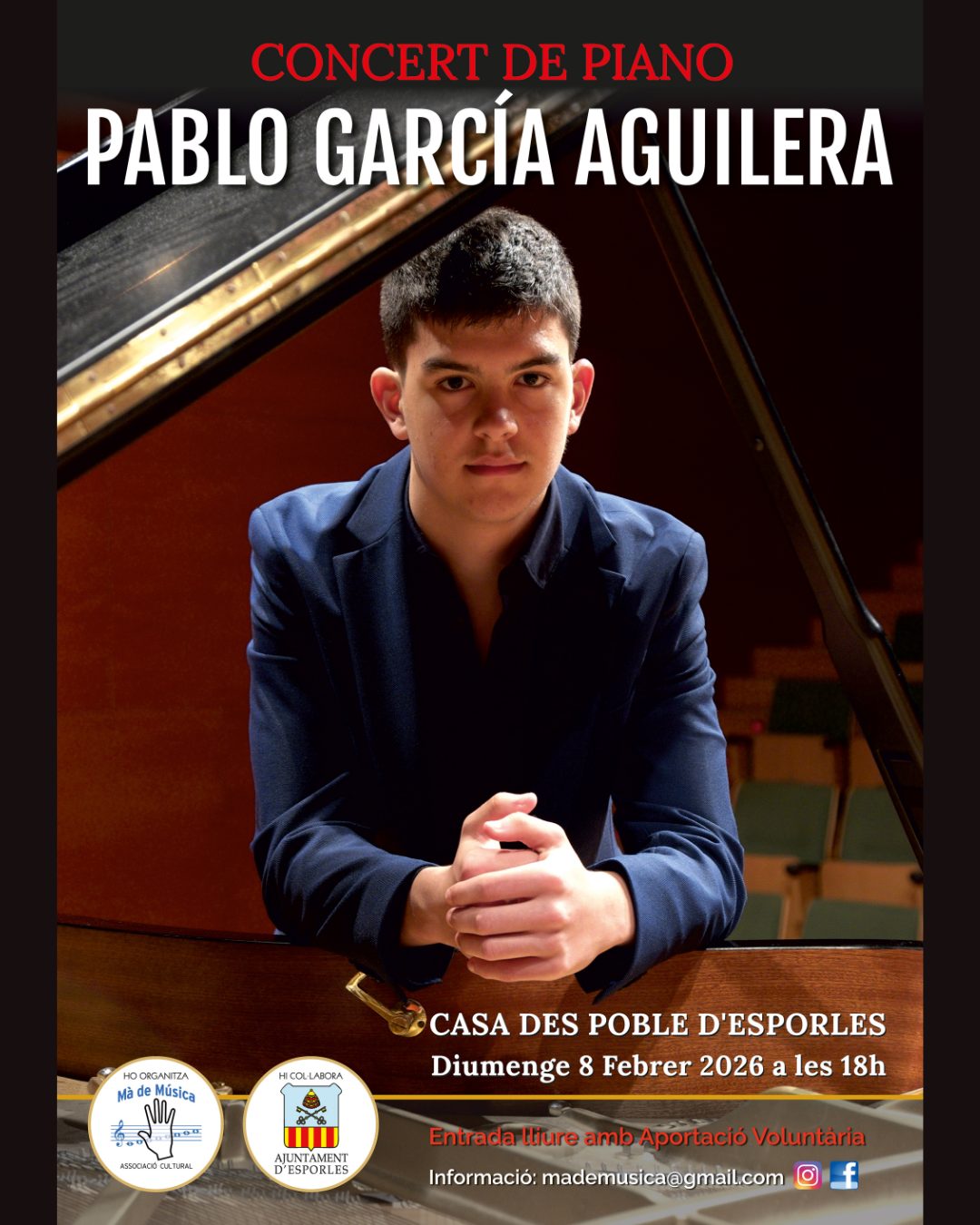 El jove pianista Pablo García Aguilera, guanyador del Premi Extraordinari Autonòmic, ens oferirà un concert excepcional amb obres de Beethoven, Chopin, Debussy i Liszt.