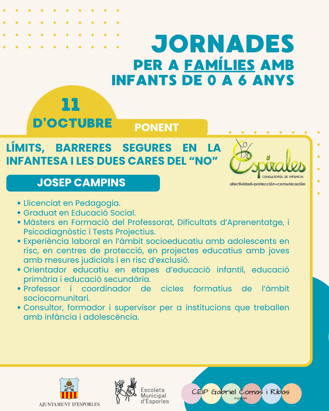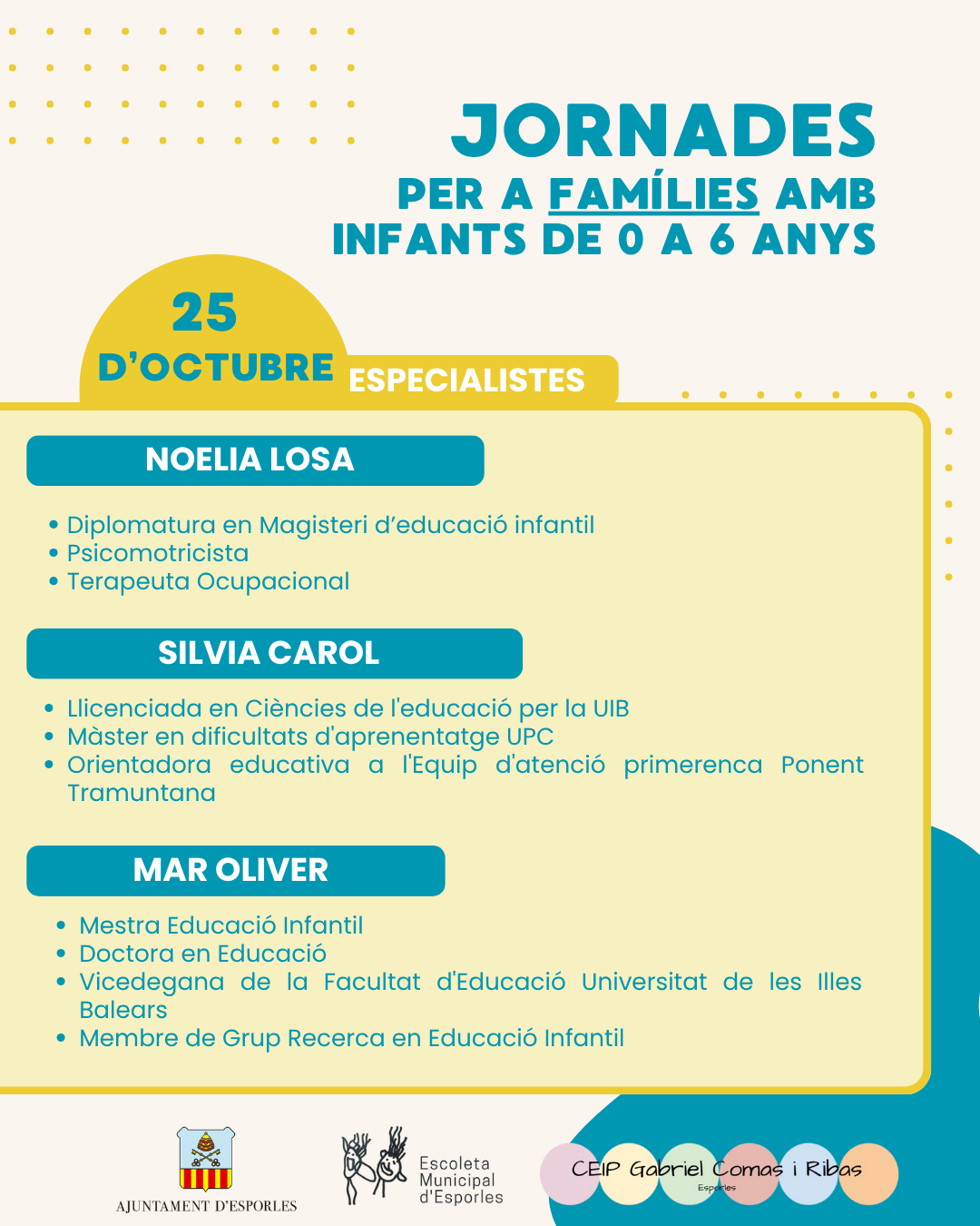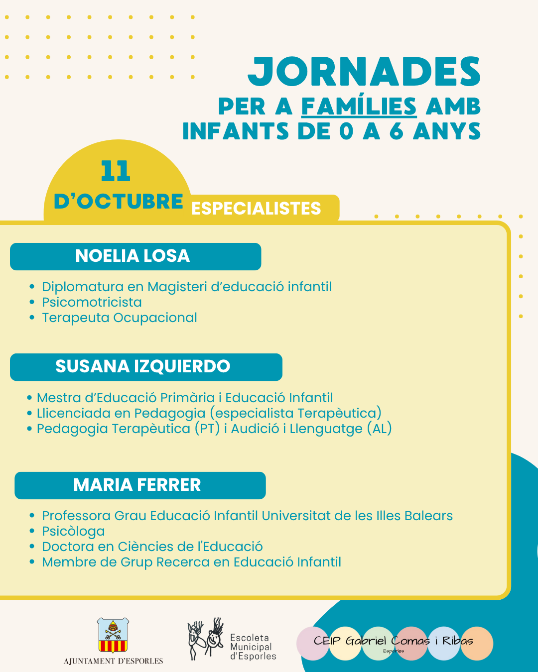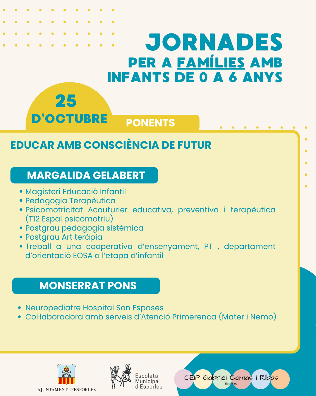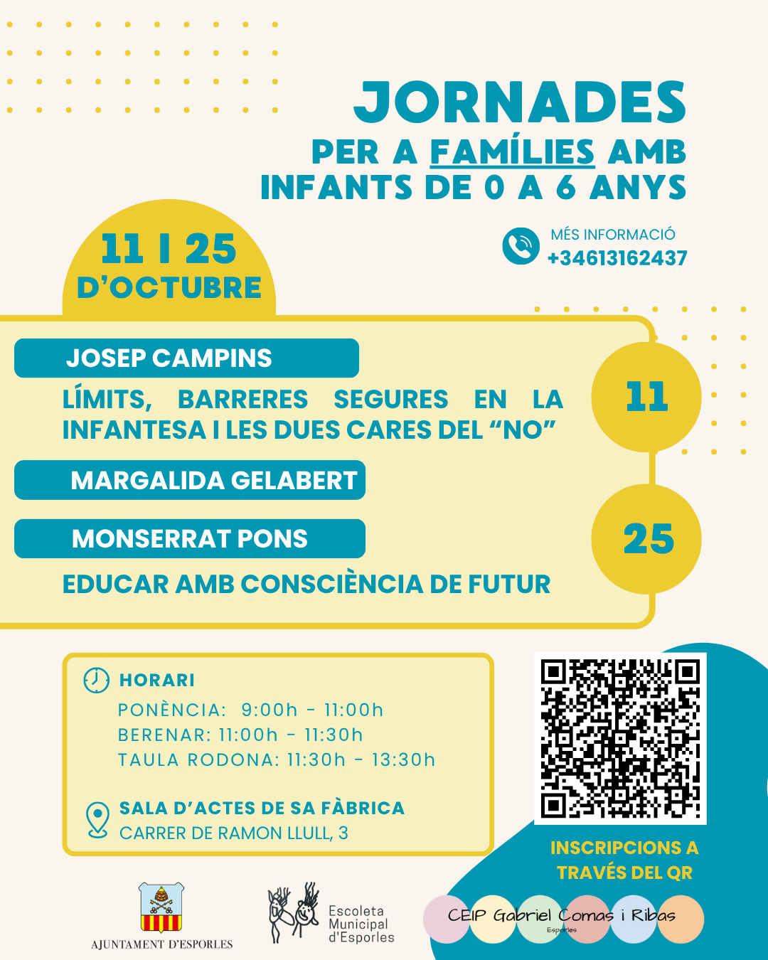 Dissabte 11 i dissabte 25 d’octubre, des de l’Ajuntament d’Esporles, l'Escoleta Municipal d’Esporles i el CEIP Gabriel Comas i Ribas, duem a terme unes jornades dirigides a famílies que tenen infants de 0 a 6 anys. Durant els dos podrem gaudir d’una ponència i una taula rodona amb diferents perfils de professionals del món de l’educació i la infància per poder obrir un espai d’aprenentatge, compartir idees i opinions juntament amb les famílies. Informem que les jornades són per a adults, no infants.