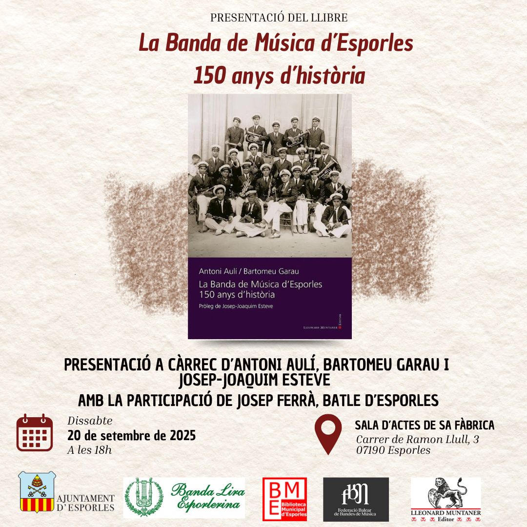 Vos convidam a la presentació del llibre "La Banda de Música d'Esporles. 150 anys d'història". A càrrec d'Antoni Aulí, Bartomeu Garau i Josep-Joaquim Esteve. Amb la participació de Josep Ferrà, batle d'Esporles.