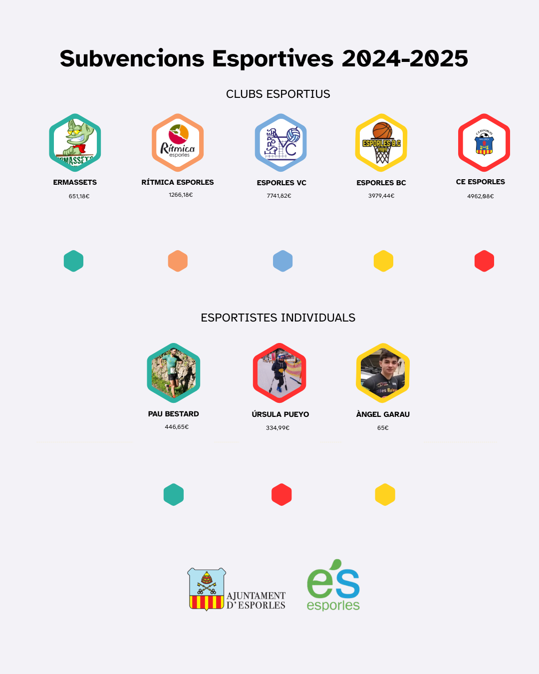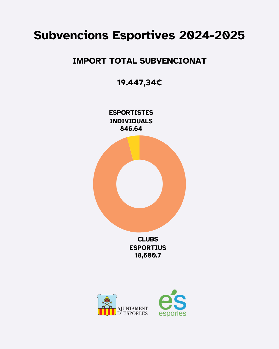 L’Ajuntament destina 19.447,34 € als clubs esportius del municipi i als esportistes individuals que practiquen esport, corresponents a la temporada 2024/2025 per als clubs i l'any 2025 per als esportistes individuals.