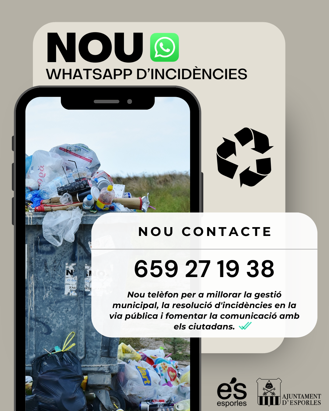 L’Ajuntament d’Esporles posa en marxa un nou servei de notificació d’incidències a la via pública a través de WhatsApp per facilitar la comunicació directa entre la ciutadania i l’Ajuntamentl. Aquest servei s’implementa mentre es treballa en la millora de l’app d’incidències, que actualment està fora de servei temporalment per actualitzacions i noves funcionalitats (l’app anterior Incidències Esporles permetia registrar problemes amb foto, ubicació i descripció).